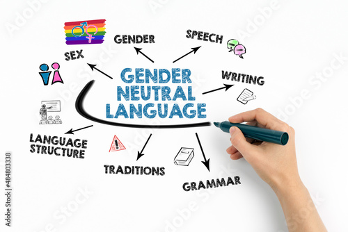 Gender Neutral Language. Chart with keywords and icons on white background