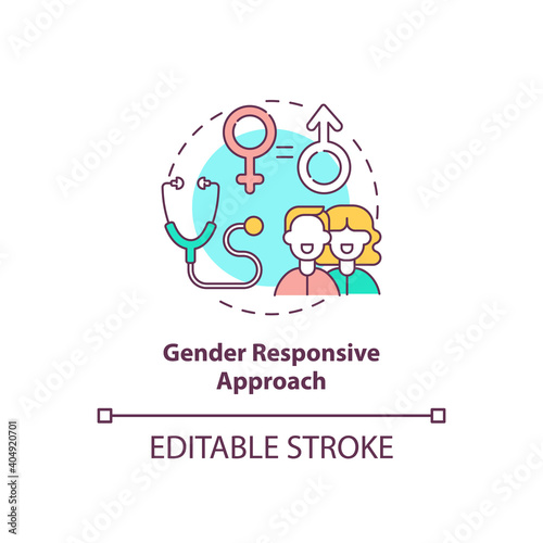 Gender responsive approach concept icon. Health programs principles. Factors at work in health system idea thin line illustration. Vector isolated outline RGB color drawing. Editable stroke
