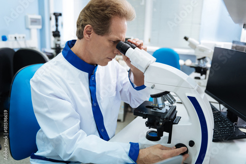 Gene analysis. Concentrated serious scientist of middle age wearing a labcoat and working with a microscope while being in the lab
