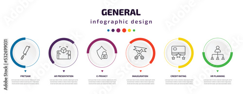 general infographic element with icons and 6 step or option. general icons such as fretsaw, ar presentation, e-privacy, inauguration, credit rating, hr planning vector. can be used for banner, info
