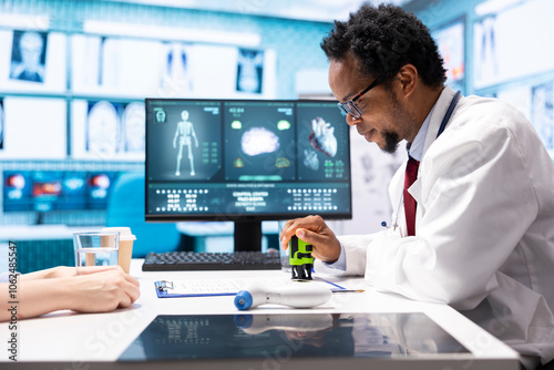 General practitioner putting his stamp on a prescription document for his patient, recommending antibiotics and vitamins as medical treatment. Doctor prescribing medicaments in cabinet.