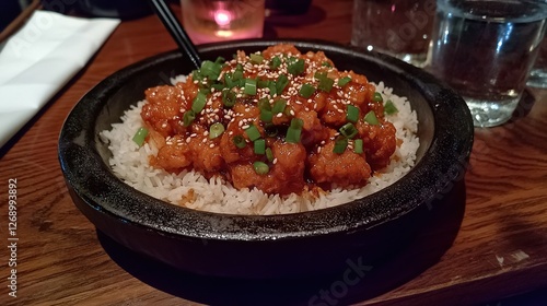 General Tso's Chicken served on a traditional Asian porcelain plate, chopsticks delicately picking up a saucy piece