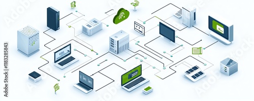 Generate a hightech business environment with interconnected cloud systems, sustainable networking equipment, and green architectural elements