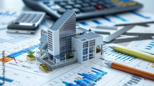 Generate a photo realistic image of a construction project team managing financial costs, with detailed budgeting charts and cost management tools; ensure the image is of high resolution for clear