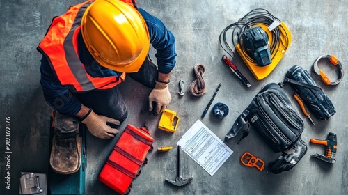Generate a photo realistic image of technicians performing maintenance on safety equipment, with tools, spare parts, and maintenance checklist visible; ensure the image is of high resolution