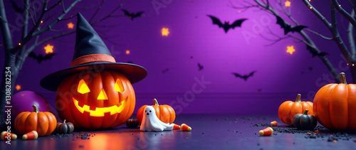Generate an AI photo of a Halloween Trick or Treat scene featuring a Jack-o'-lantern, witch hat, ghost, balloons, pumpkins, bats, candy corn, and spooky decorations on a purple background. Depth and