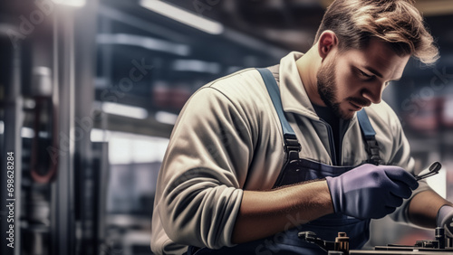 Generated. AI. Auto mechanic in overalls repairs car in workshop. Car engine diagnostics. Illustration.