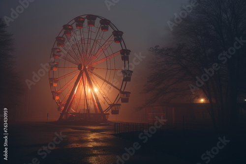 Generated AI picture of carnival with Ferris wheel in dark misty amusement park