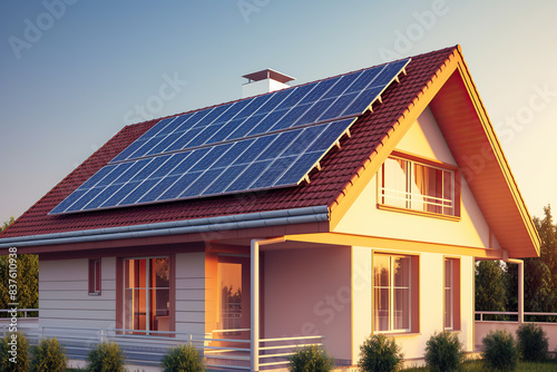 generated illustration of newly construced home with solar panels on roof.