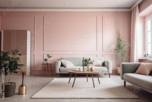 generated illustration of coffee table, potted plants next to grey scandinavian sofa in pink living room