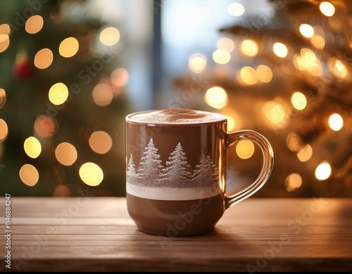 Generated image A hot chocolate mug with a Christmas tree in the background, lights twinkling