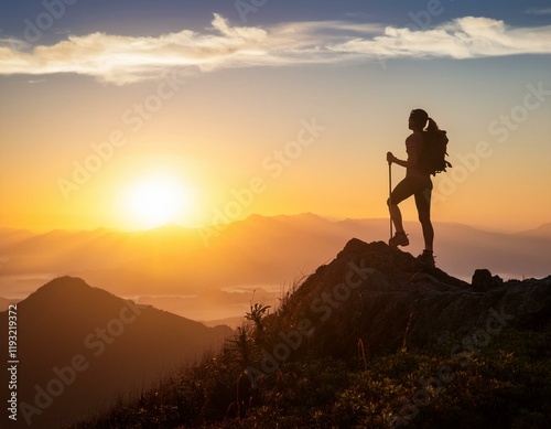 Generated image Silhouette of couple hiking and holding hands on the top of mountain, surreal sunrise
