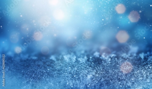 Generative AI : Beautiful Christmas background with with crystals of hoarfrost and snow closeup macro on a blue background Natural winter background