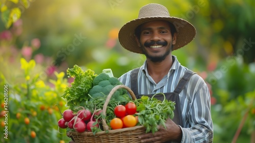 Generative AI : Happy farmer carrying tomatoes in a greenhouse