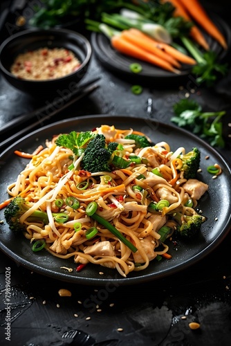 Generative AI : plate of stir-fried asian bright rice band noodles with cooke shredded chicken