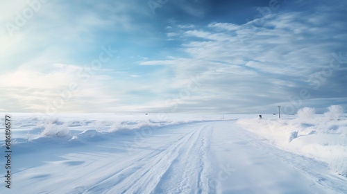 Generative AI : Snow-covered country road through the fields