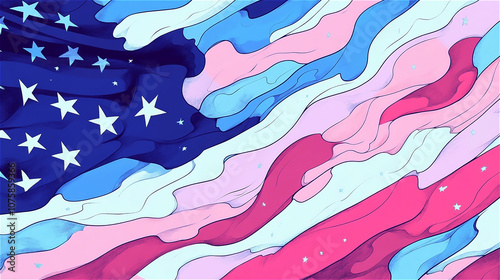 カラフルな波模様で表現されたアメリカ国旗、ポップアート風の抽象デザイン。generative ai