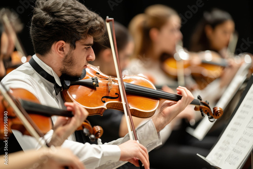 オーケストラでヴァイオリンを演奏する男性 Generative AI