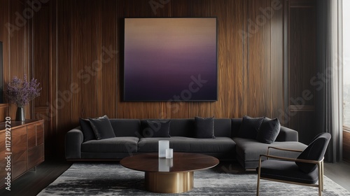 Generative AI, A bold living room with a charcoal sectional sofa and luxurious wood panel backdrop