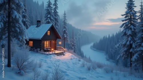 Generative AI, a cabin in the woods with a river running through it and snow on the ground and trees around it, winter, a digital rendering, minimalism