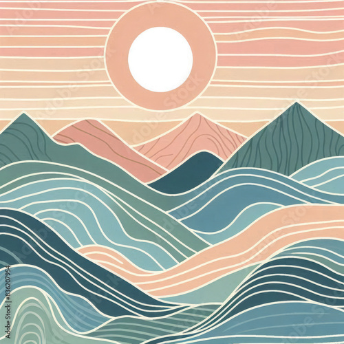 Generative AI A unique boho minimalist artwork featuring a simple yet rich blend of natural elements, geometric motifs, and tranquil color palette, A distinctive boho minimalist piece, Cool Boho Arts.