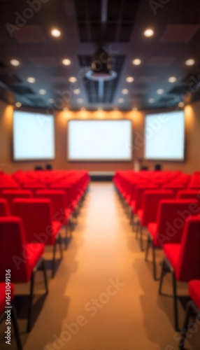 Generative AI: A view of a contemporary auditorium with rows of red seats and display screens