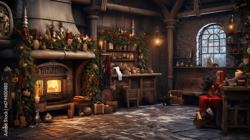 Generative AI, Christmas interior rural background, Santa Claus rustic workshop.