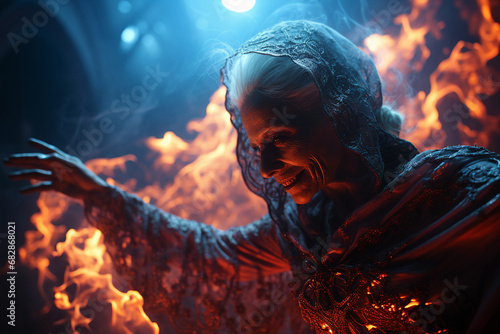Generative ai collage of powerful dangerous evil witch lady doing fire spell