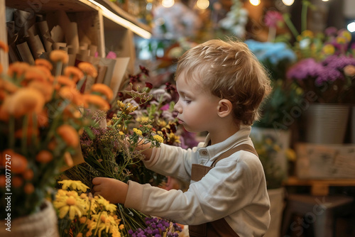 Generative AI Cute Baby kid child girl boy in Florist Shop Surrounded by Flowers
