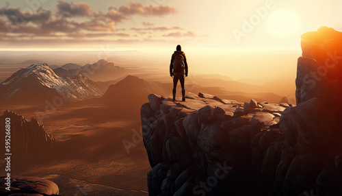 Generative AI illustration epic landscape of single hiker looking across mountian range and plateau during golden hour