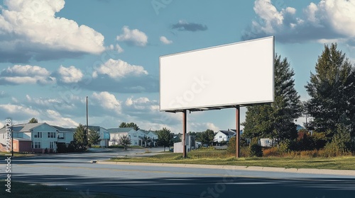 Generative AI illustration of an empty billboard standing on a busy asphalt road, with residential homes and apartments in the background, offering space for creative ad mockups.