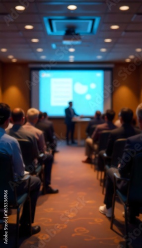 Generative AI image depicts a business conference with a presenter, audience and projection screen