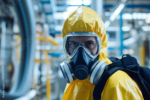 Generative AI image of nuclear power plant worker in hazmat suit with full face respirator mask