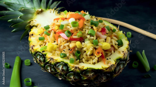 Generative AI image of the Pineapple Fried Rice from Thailand. The fried rice is served in a hollowed pineapple boat