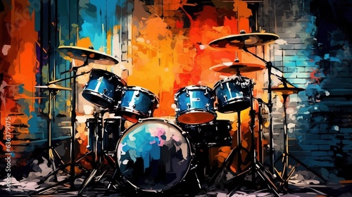 Generative AI, Jazz music street art with drums musical instrument silhouette. Ink colorful graffiti art on a textured wall, canvas background.