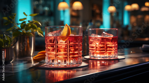 Generative AI, Negroni cocktail in a glass goblet on a table of a bar, restaurant, evening light, alcoholic drink, orange slice, gin, vermouth, ice, liquid, transparent glass, dinner, stylish cafe
