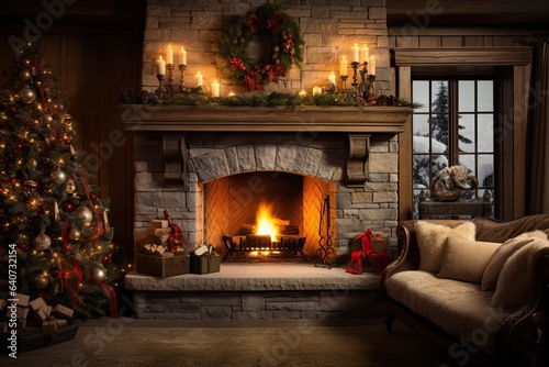 Generative ai of Cozy living room with a chimney warms the house during Christmas.