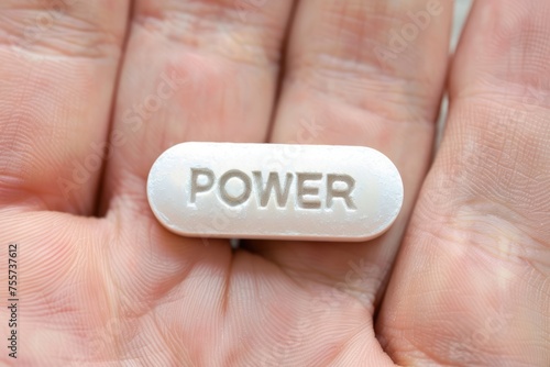 Generative AI, person is holding on the hand white pill with word Power, nutrition and healthcare concept