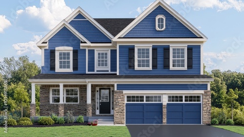 Generative AI rendering of a modern home with two-car garage, blue siding, and elegant stone walls for contemporary living