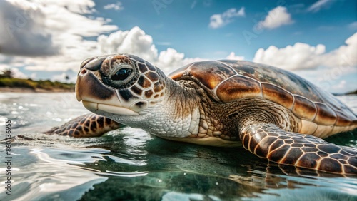 Generative ai. sea turtle, underwater, clear water, detailed texture, vibrant colors, natural habitat, sunlight rays, aquatic life, marine environment, swimming turtle, ocean scene