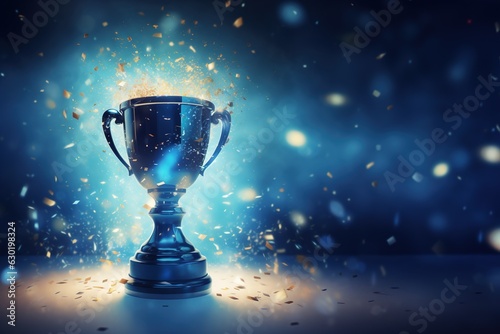 Generative AI, Winner trophy with flames, blue golden champion cup with falling confetti on blue background.