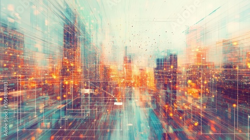 Generative AI-inspired lines and dots weaving through a bustling urban landscape