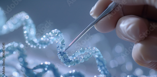 Genetic engineering with DNA manipulation. Close-up of tweezers precisely targeting double helix against light blue background.