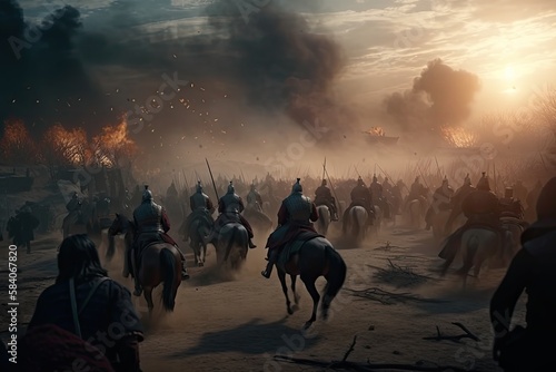 Genghis Khan and his Mongolian generals and warriors fighting under the city of Khorezm. Generative AI.