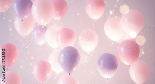 Gentle and romantic composition of floating pink balloons over a pastel background, ideal for birthdays or romantic events.