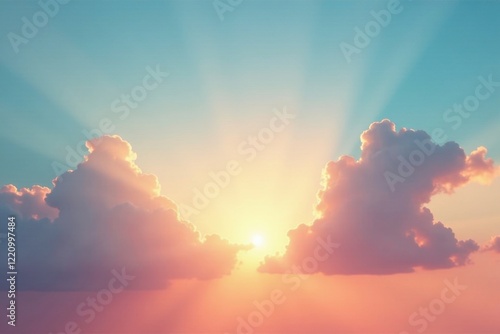 Gentle dawn sky with wispy clouds and sun rays breaking through, morning, gentle hues, soft light