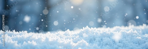 Gentle flakes fall softly on pristine white surface, quiet, winter wonderland