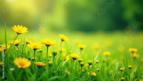 Gentle green fields dotted with bright yellow daisies sway in soft breeze, daisy, nature, sunny