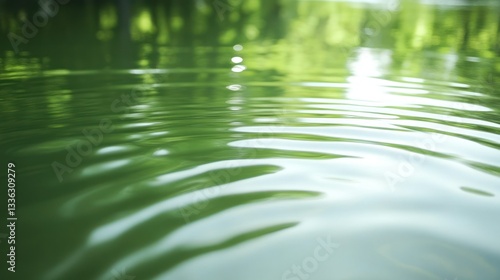 Gentle green water surface reflects the surrounding trees and sky
