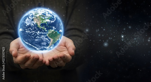Gentle hands cradle the Earth, a luminous sphere of life, radiating cosmic beauty and infinite possibilities, symbolizing humanity’s delicate connection with the universe.